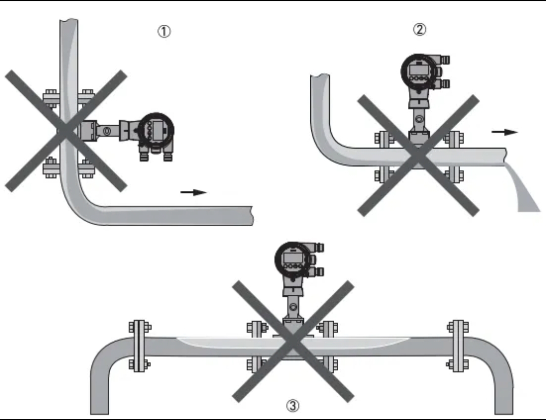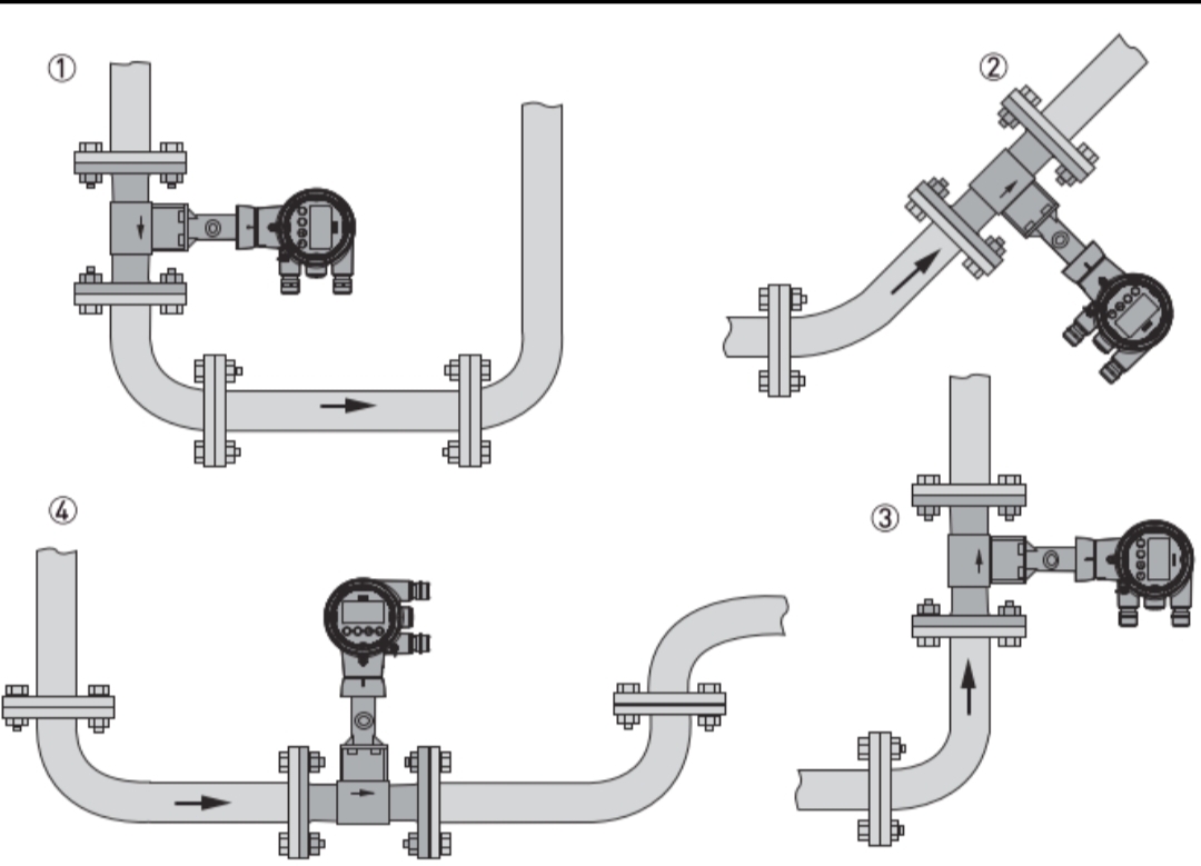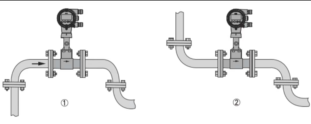 4. Kun mitataan korkeita lämpötiloja, valmistajat toimittavat yleensä split-tyyppisiä pyörrevirtausmittareita. Integroiduissa pyörrevirtausmittareissa lähettimen suunta tulisi määrittää väliaineen lämpötilan perusteella. Esimerkiksi korkean lämpötilan höyryä mitattaessa lähetin tulee suunnata sivuttain tai alaspäin (jotkut valmistajat eivät suosittele asennusta alaspäin, koska nestettä voi päästä lähettimen päähän).