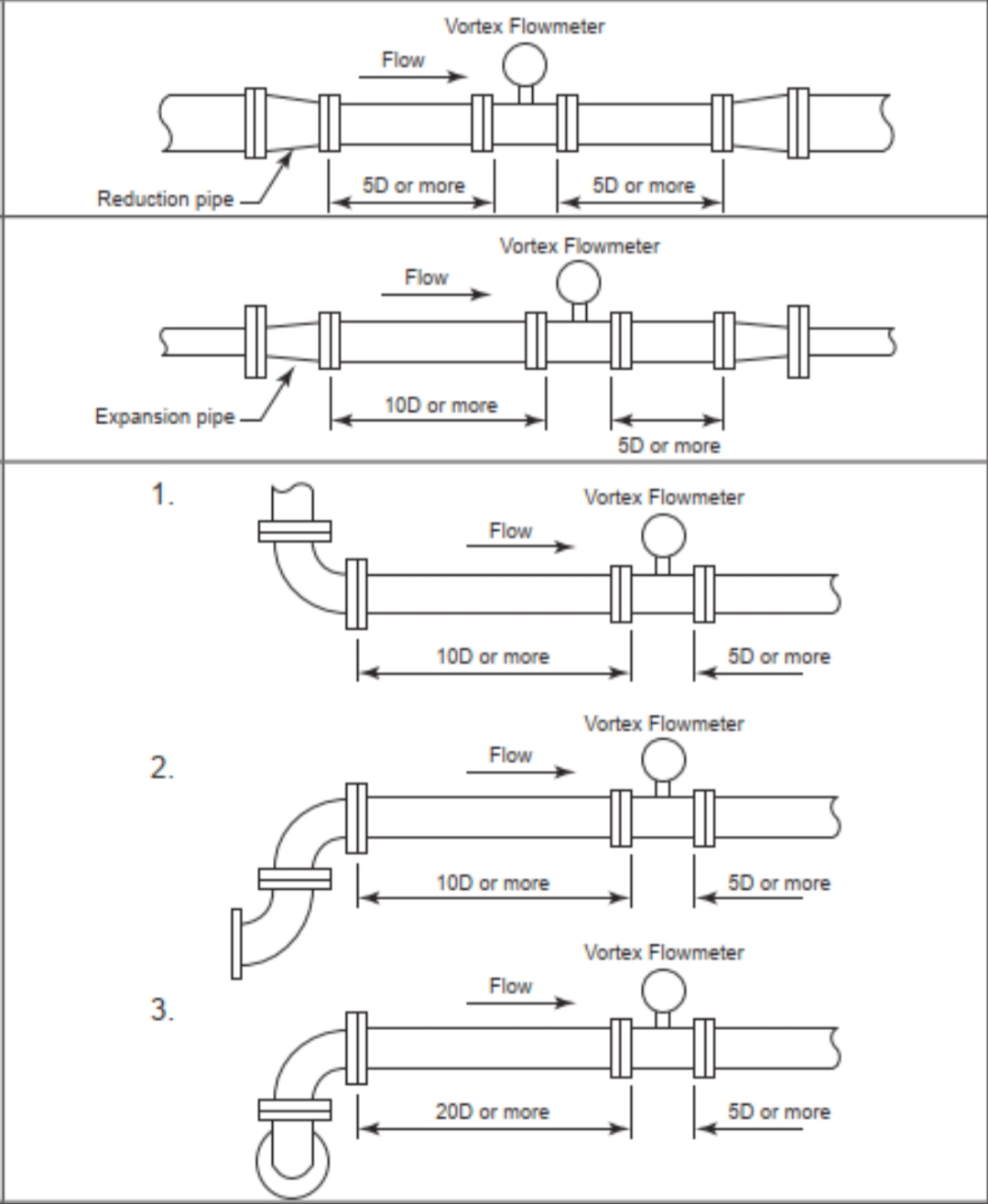 3. Suorat putkiosat ylä- ja alavirtaan (jos lämpötila- ja paineinstrumentteja tarvitaan, ne tulee asentaa virtausmittarin jälkeen. Myös alavirran mittalaitteiden tulee sijaita suoran putkiosan ulkopuolella. Suositeltu järjestys useille instrumenteille on: virtausmittari, painelähetin, lämpötilalähetin). Yleensä katso suoran putken pituusvaatimukset, jotka on määritetty valmistajan tuotenäytteessä (tai 15D:n ylävirtaan ja 5D:n alavirtaan instrumenttien käsikirjojen mukaan). Ilmoita putkistojen suunnittelutiimille etukäteen pyörrevirtausmittarin ylä- ja alavirran suoran putken vaatimuksista. Kun laitteen valmistaja on valittu, asennusvaatimukset on vahvistettava uudelleen valmistajan ohjeiden mukaisesti.
